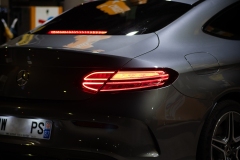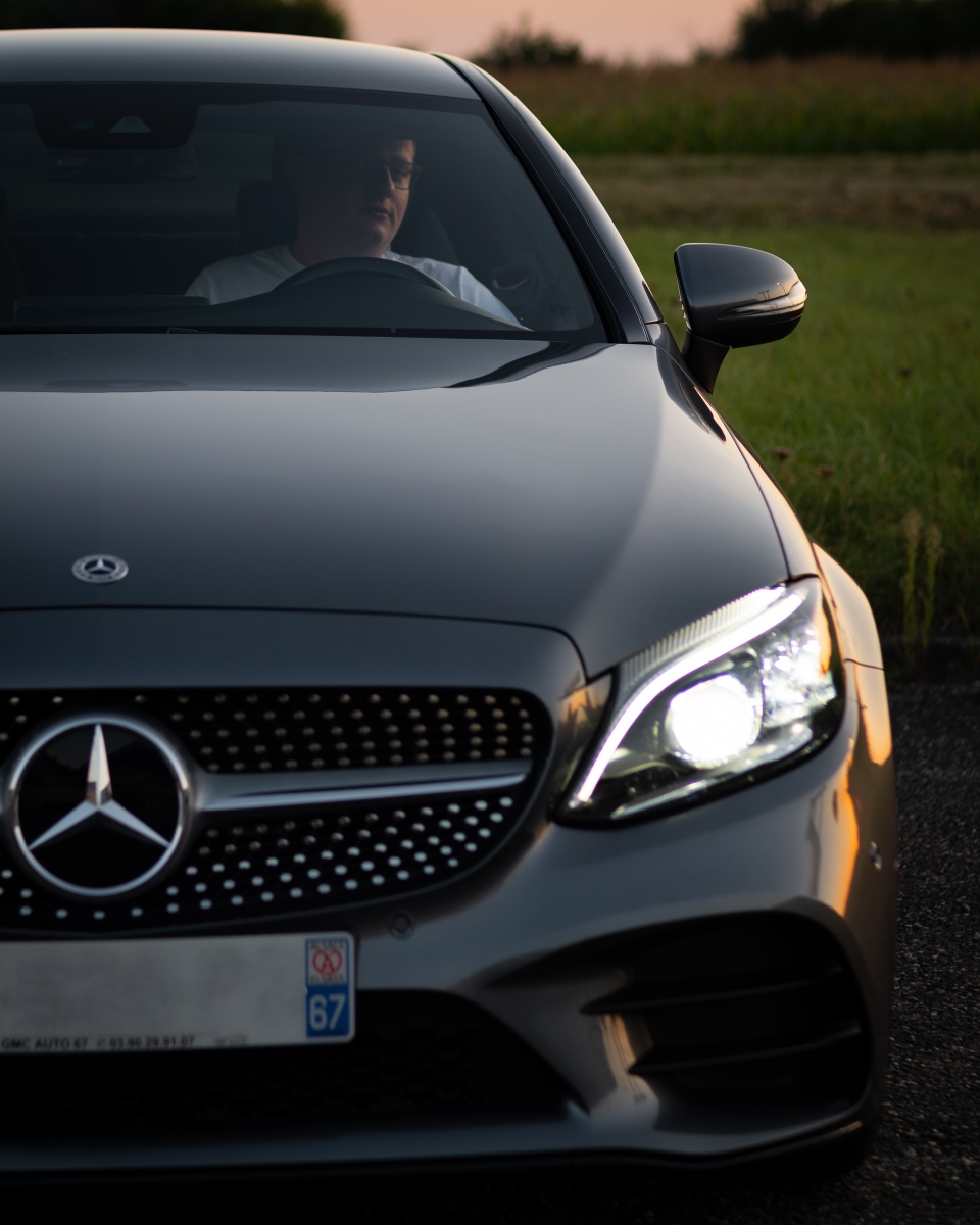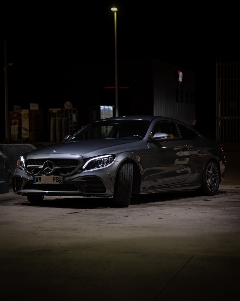 Découvrez la Mercedes C300 sous un autre angle, capturée lors d'un shooting au coucher du soleil et à la lueur des néons d'une station essence, mêlant élégance et mystère entre lumière dorée et ambiance nocturne